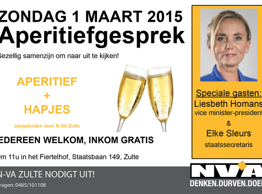 Zondag 1 maart is iedereen welkom vanaf 11 uur voor een aperitiefgesprek met Liesbeth Homans. Het aperitief en een ruim assortiment hapjes worden jullie aangeboden door onze afdeling.